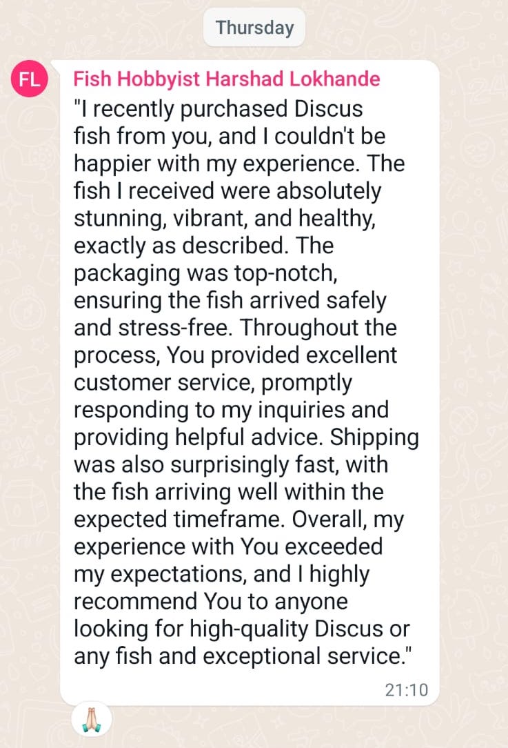 Discus fish require specific water conditions, including temperature, pH, and cleanliness, to thrive. We provide detailed care instructions with every purchase and have a wealth of resources available on our website to help you maintain a healthy environment for your Discus fish.